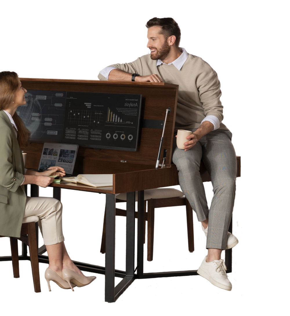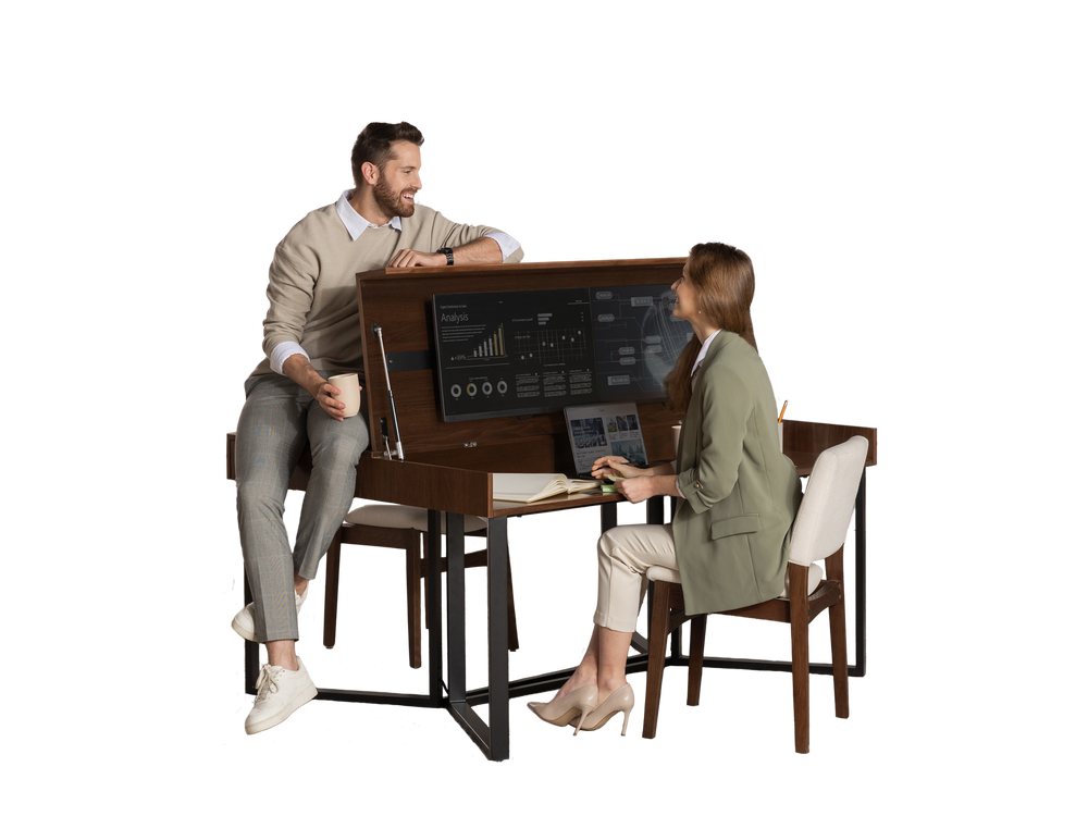 Seamlessly switch from 9-5 to 5-9, with the dining table that becomes two desks. Complete with integrated storage and cable management so work from home doesn't interfere with life at home.