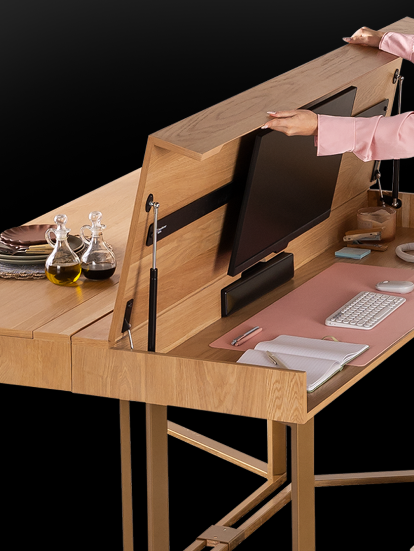 Seamlessly switch from 9-5 to 5-9, with the dining table that becomes two desks. Complete with integrated storage and cable management so work from home doesn't interfere with life at home.